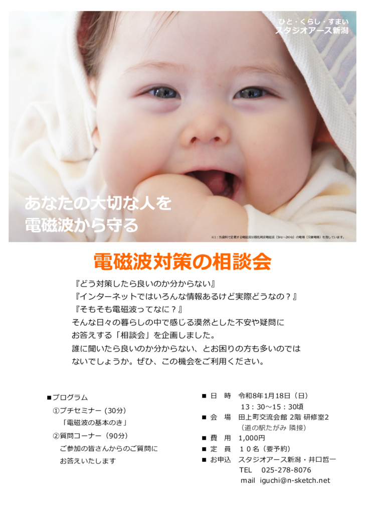 | プログラム | ①プチセミナー (30分) 「電磁波の基本のき」 ②質問コーナー(90分) ご参加の皆さんからのご質問にお答えいたします |